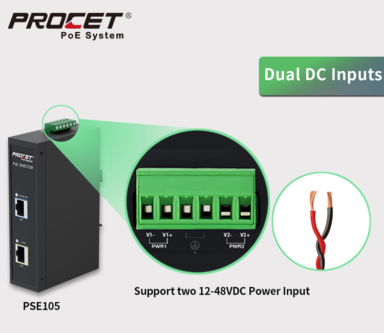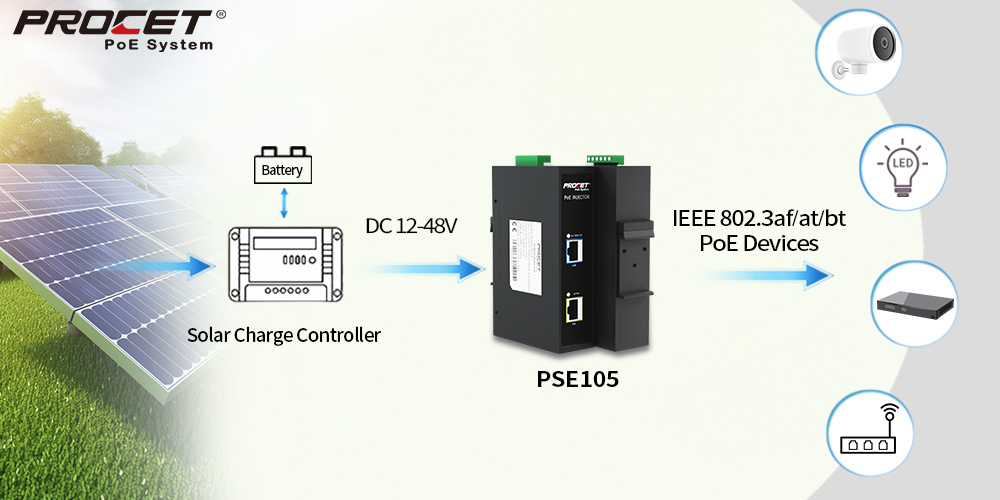 PROCET 105 series Industrial PoE Power Supply devices supports redundant power input, can be connected to external solar power, DC terminal power supply, with reverse polarity protection, power supply magnetic protection design, it can avoid burning equipment due to wrong wiring, support dual-channel DC input to ensure high reliability of the network system. The PoE port can withstand 6KV, 10/700uS impulse voltage waveform. Industrial Ethernet is a cost-effective optimal solution for new energy and other industrial network communication construction. PROCET 105 series industrial PoE power supply equipment is widely used in solar power generation systems, vehicles, RVs, VoIP IP telephone systems, powerful optical fiber ring networks, etc. .