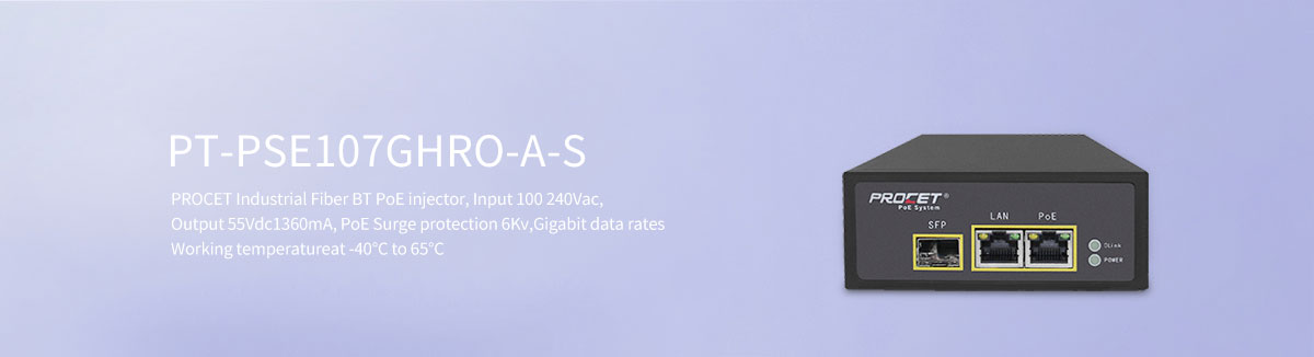 PT-PSE107GHRO-A-S Fiber Optic PoE Injector specially designed for complex industrial backhaul and networking applications, special scenarios, like highway side, exurb, etc.. Enclosed in an IP20 high-impact metal case but can work outdoor by covered with waterproof case.