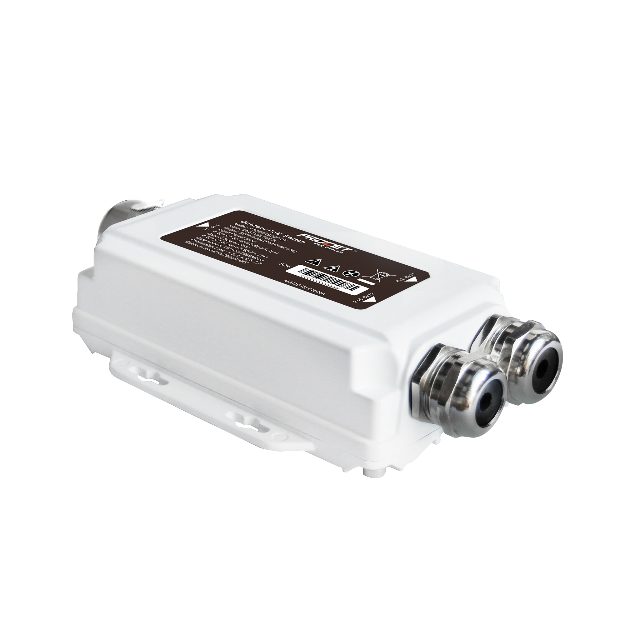 Procet outdoor Wall-mounted IP67 PoE surge protector, Input 44-57Vdc, Output 100W (Max.), Surge protection 20KV, Max Discharge Current: 20KA, Working temperature at -40℃ to 65℃, 10GbE data rate