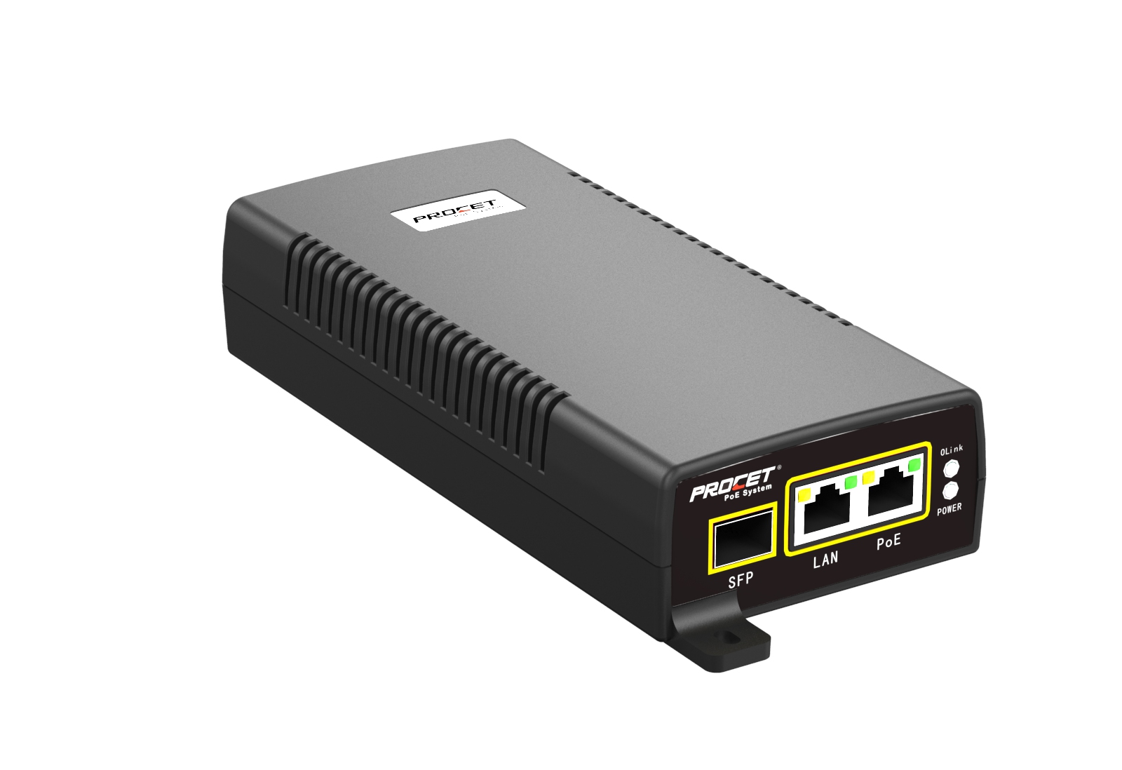PROCET 26W 24Vdc Output PoE Injector, Input 100-240Vac, Output 24Vdc 1100mA, Surge protection 2Kv, Working temperature at 0℃ to 40℃.