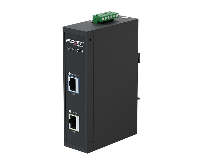 Procet Industrial BT PoE injector, Input 100-240Vac, Output 55Vdc 1100mA, Surge protection 6KV, Working temperature at -40℃ to 65℃, Gigabit data rates