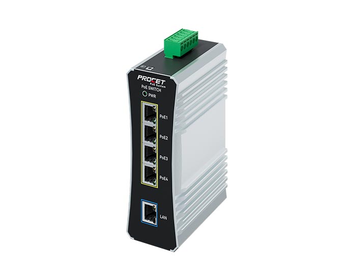 Procet Indoor DIN Rail Industrial Zinc Alloy IP40 PoE Surge protector, operating voltage 60Vdc(Max), Output 110W (Max.), Surge protection 20Kv, Working temperature at -40℃ to 85℃.