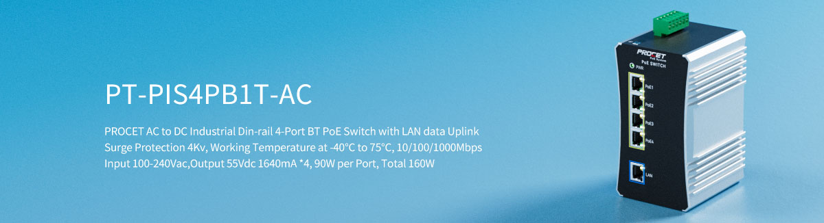 | Key Features | 4-Port BT 90W PoE Switch, Total 160W AC to DC Industrial PoE can be outdoor use by covered with waterproof case 10/100/1000Mbps Surge protection at PoE port DIN Rail mount IP40 high-impact metal enclosure Extend temperature from -40℃ to 75℃ Diagnostic LEDs |